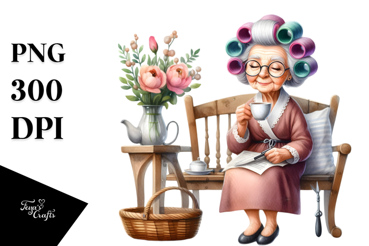 Old Lady Watercolor Bench Hair Curlers | Sublimation | example image 1