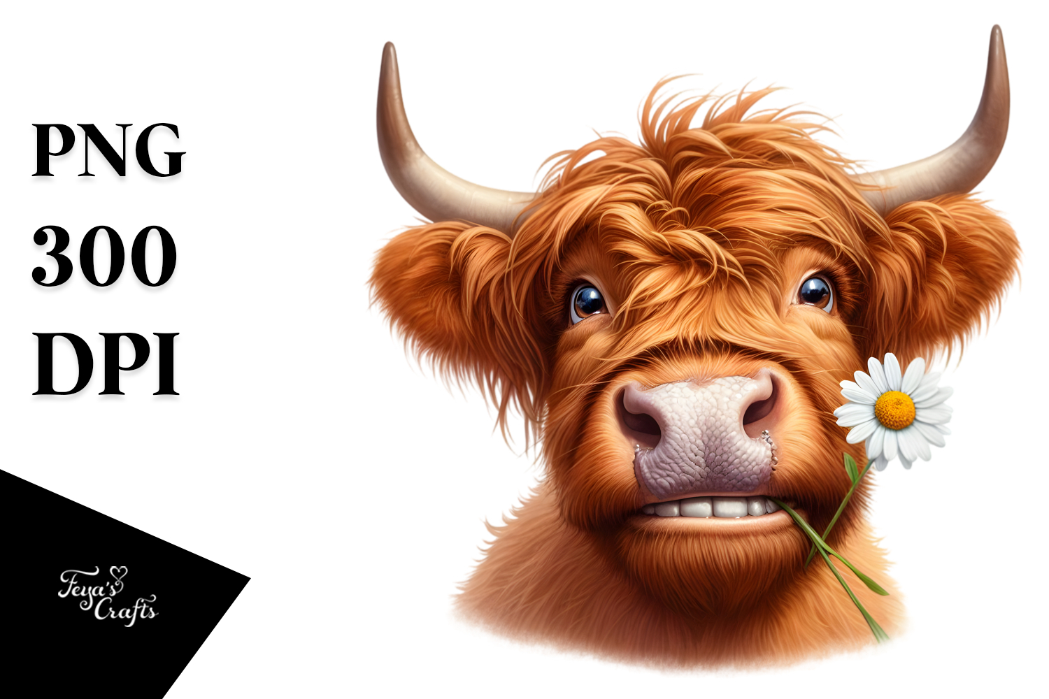 Watercolor Highland Cow Portrait Daisy | Sublimation Clipart example image 1