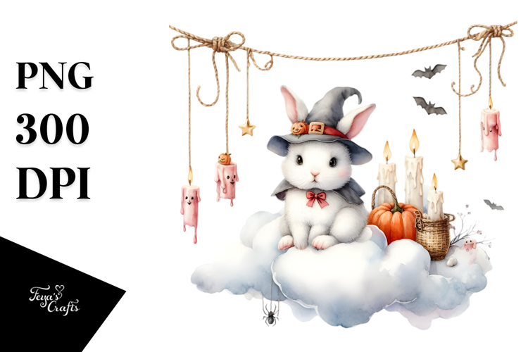 Watercolor Bunny Dressed for Halloween Sitting on Cloud PNG example image 1