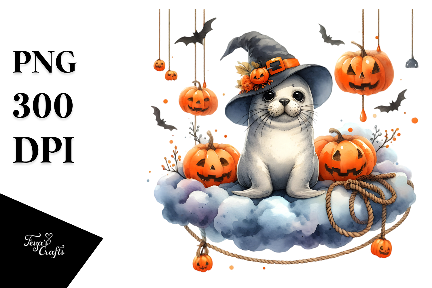 Watercolor Seal Dressed for Halloween Sitting on Cloud PNG example image 1