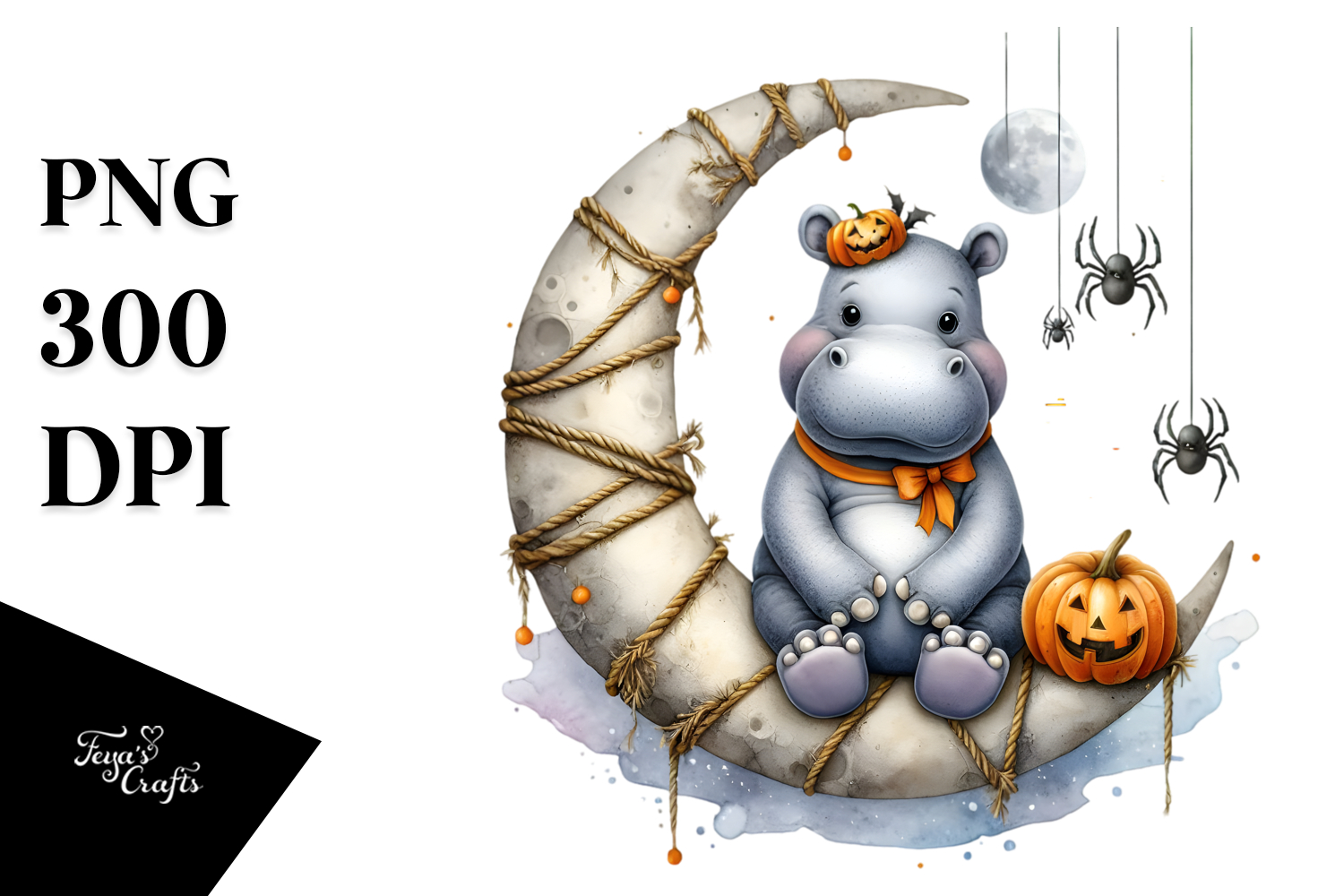 Hippo Dressed for Halloween, Watercolor PNG example image 1