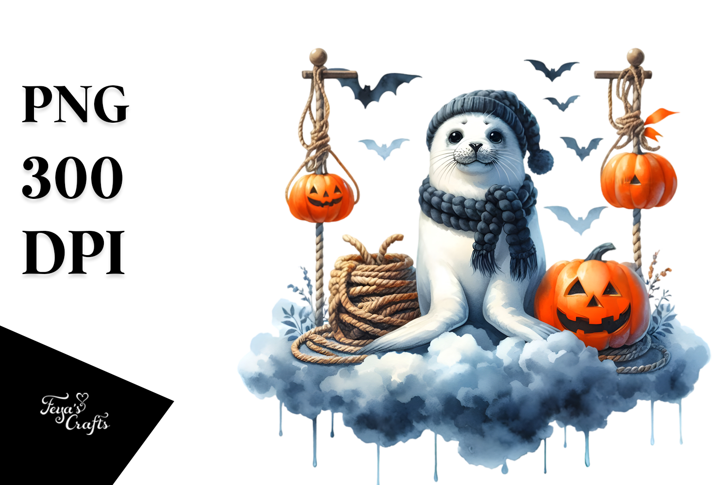Seal Dressed for Halloween, Watercolor PNG example image 1