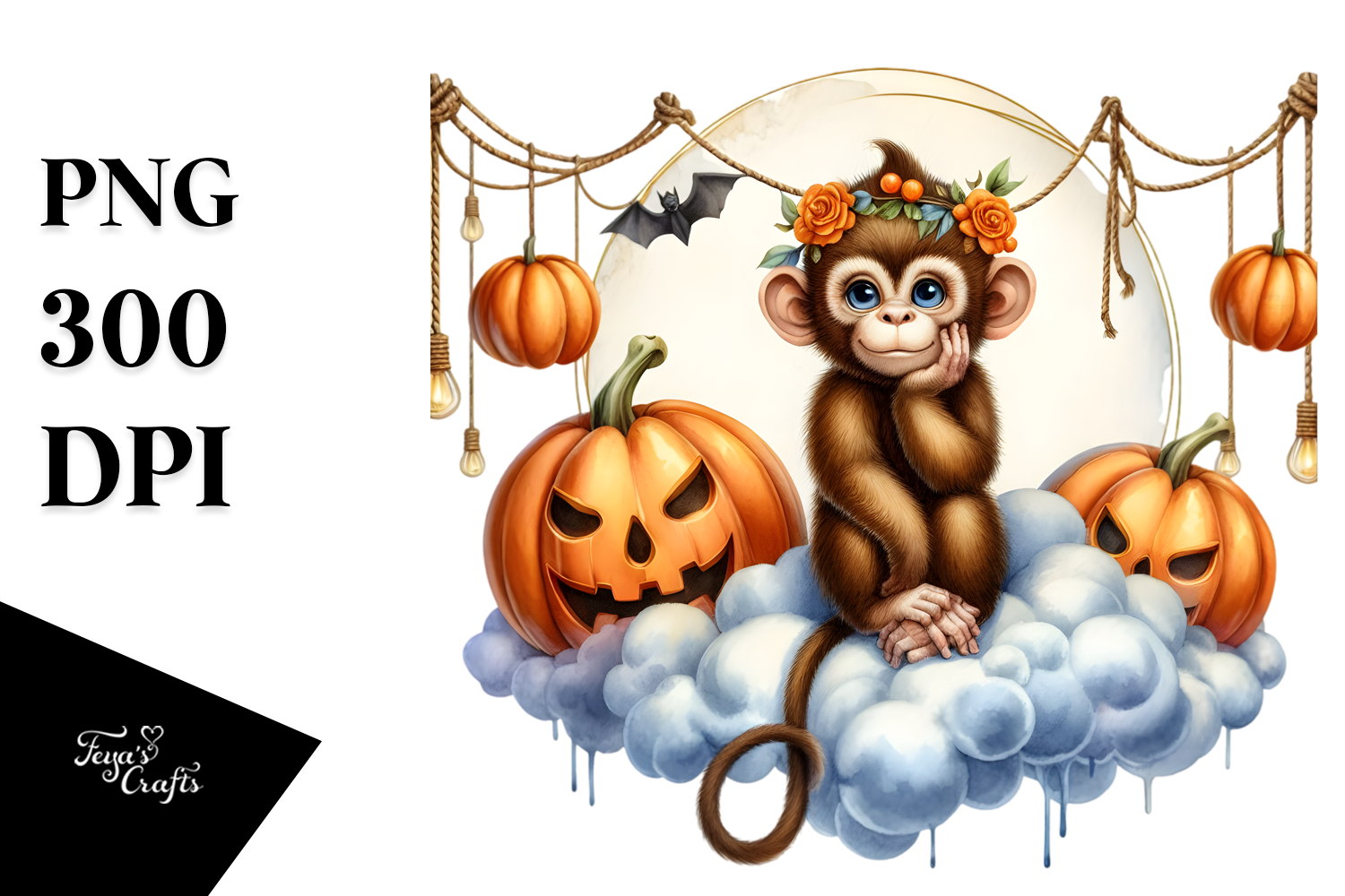 Animal Whimsical Halloween Cute Spooky Monkey Cloud Ropes Jackolanterns