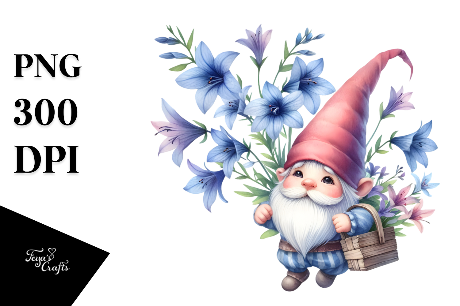 Floating Gnome with Lobelia, Unique Watercolor PNG example image 1