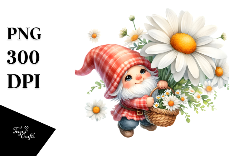 Watercolor Gnome with Large Daisy, PNG example image 1