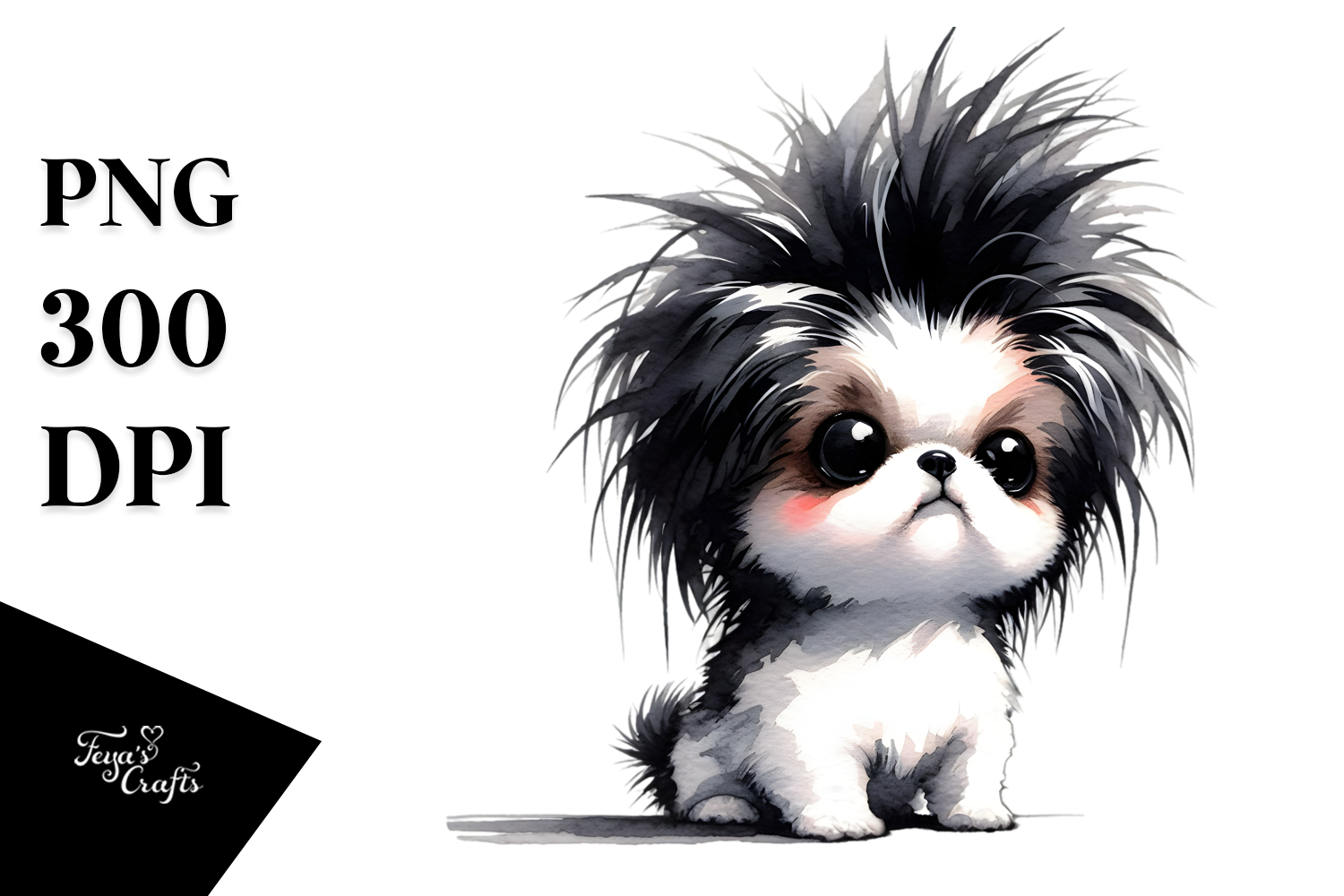 Watercolor Cute Big Baby Head Body Expressive Small Japanesechin
