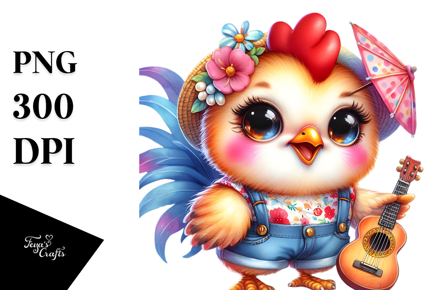 Watercolor Cute Vibrant Smiling Bigeyes Babyrooster Summerclothes Tinyguitar Tinytent