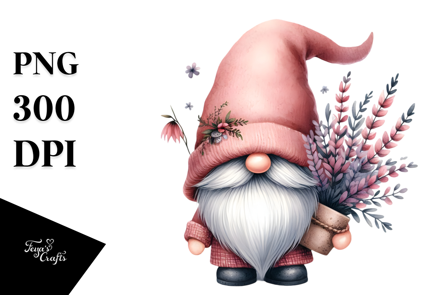Watercolor Cute GNOME with Big Hat and Iris PNG example image 1