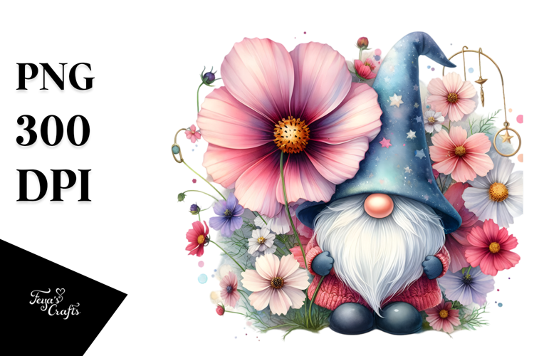 Similar Design Products to Cute Watercolor Gnome with Big Hat and Cosmos, PNG