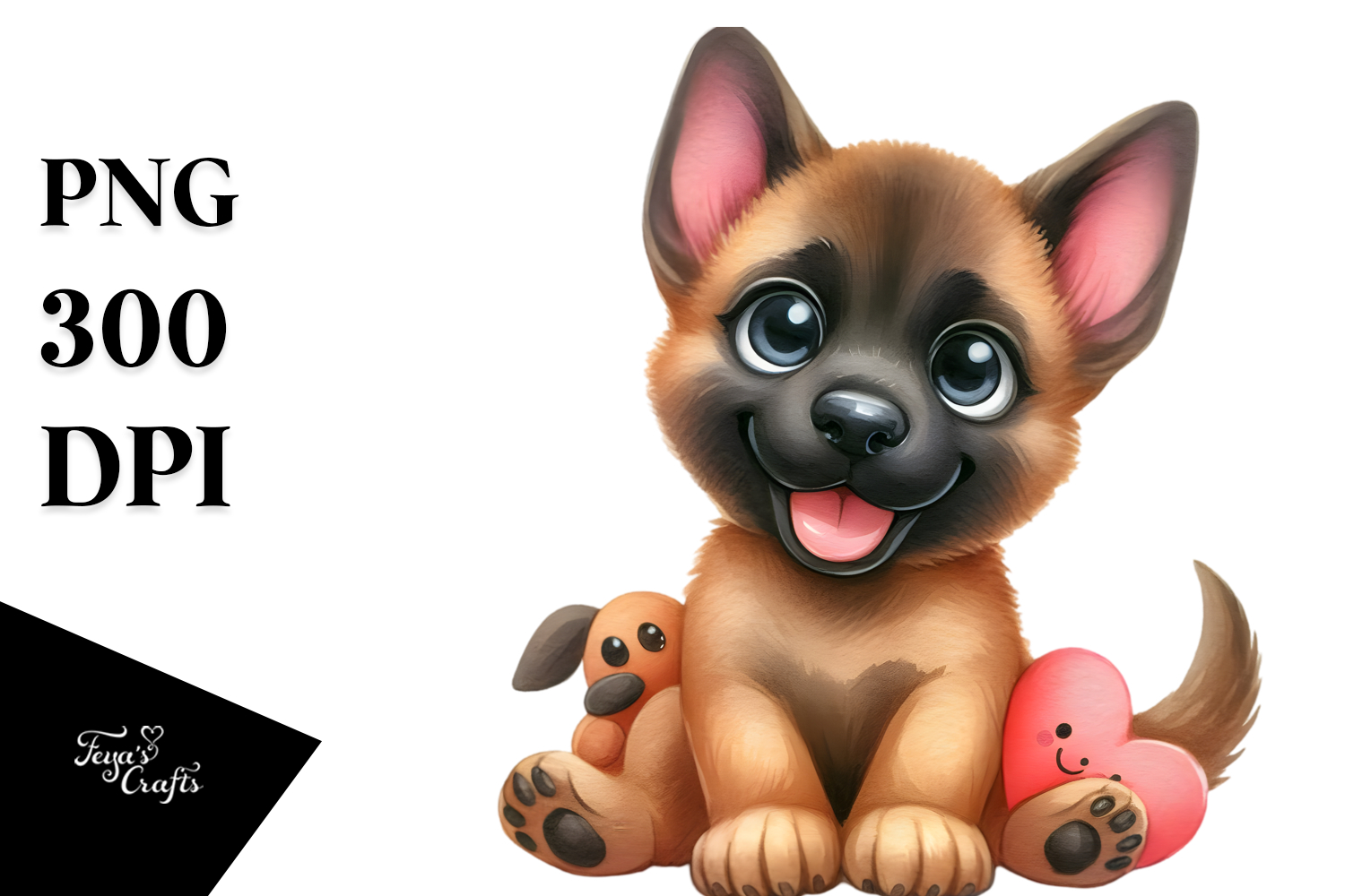 Watercolor Cute Cartoon Malinois with Big Eyes, PNG example image 1
