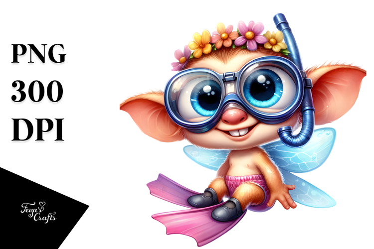Vibrant Watercolor Goofy Cute Baby Lion with Snorkel Set, example image 1