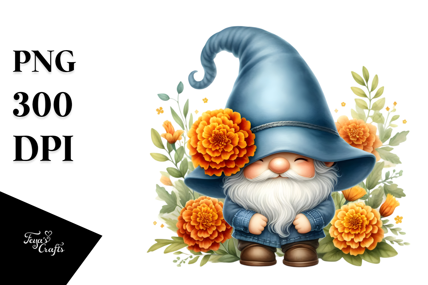 Cute Gnome with Marigold Floral Frame PNG example image 1