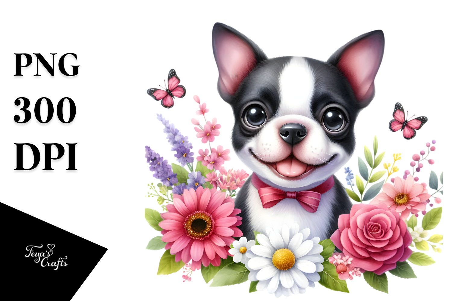 Happy Cute Boston Terrier Dog, Watercolor Design
