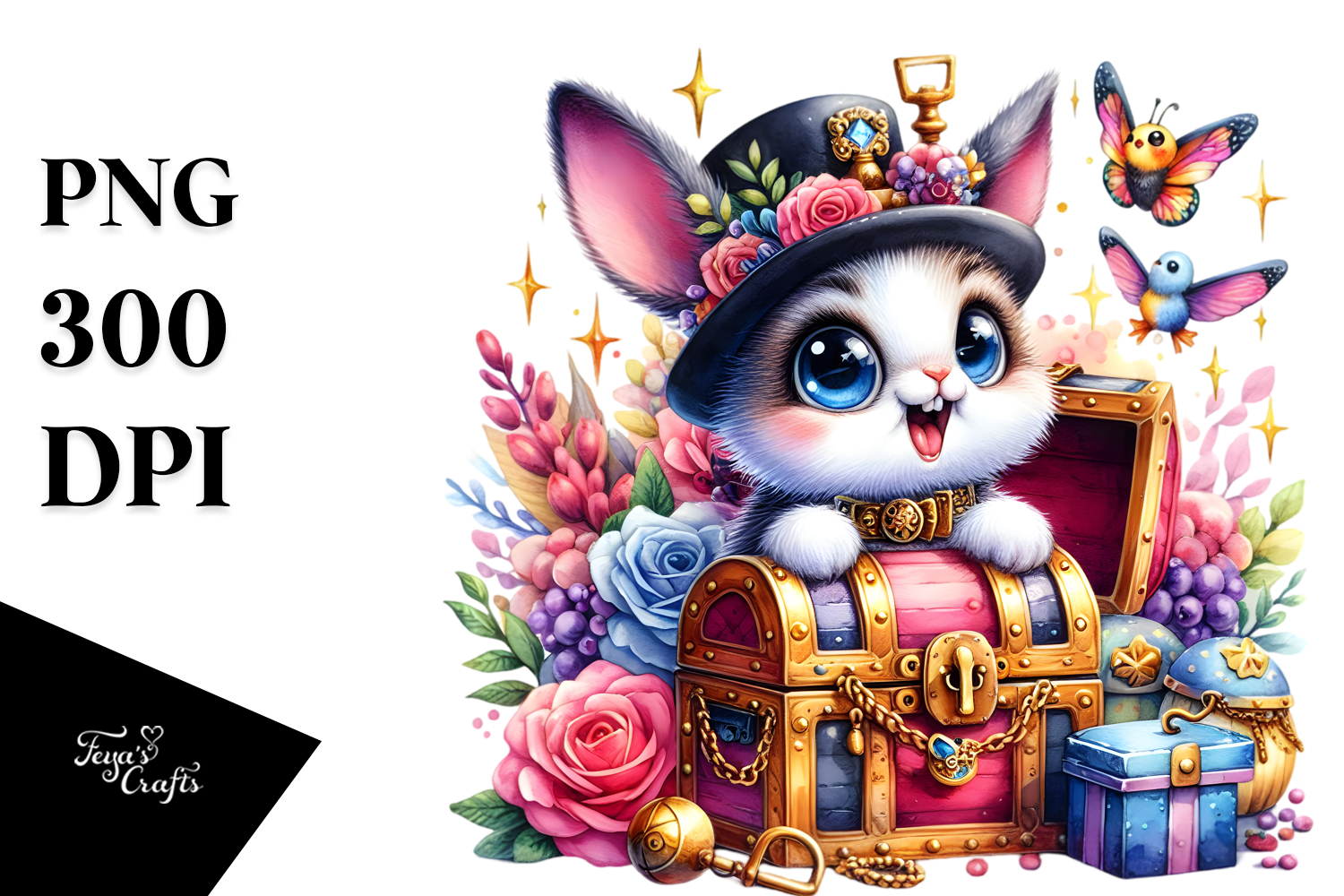 Vibrant Watercolor Rabbit with Treasure Chest, Transparent example image 1