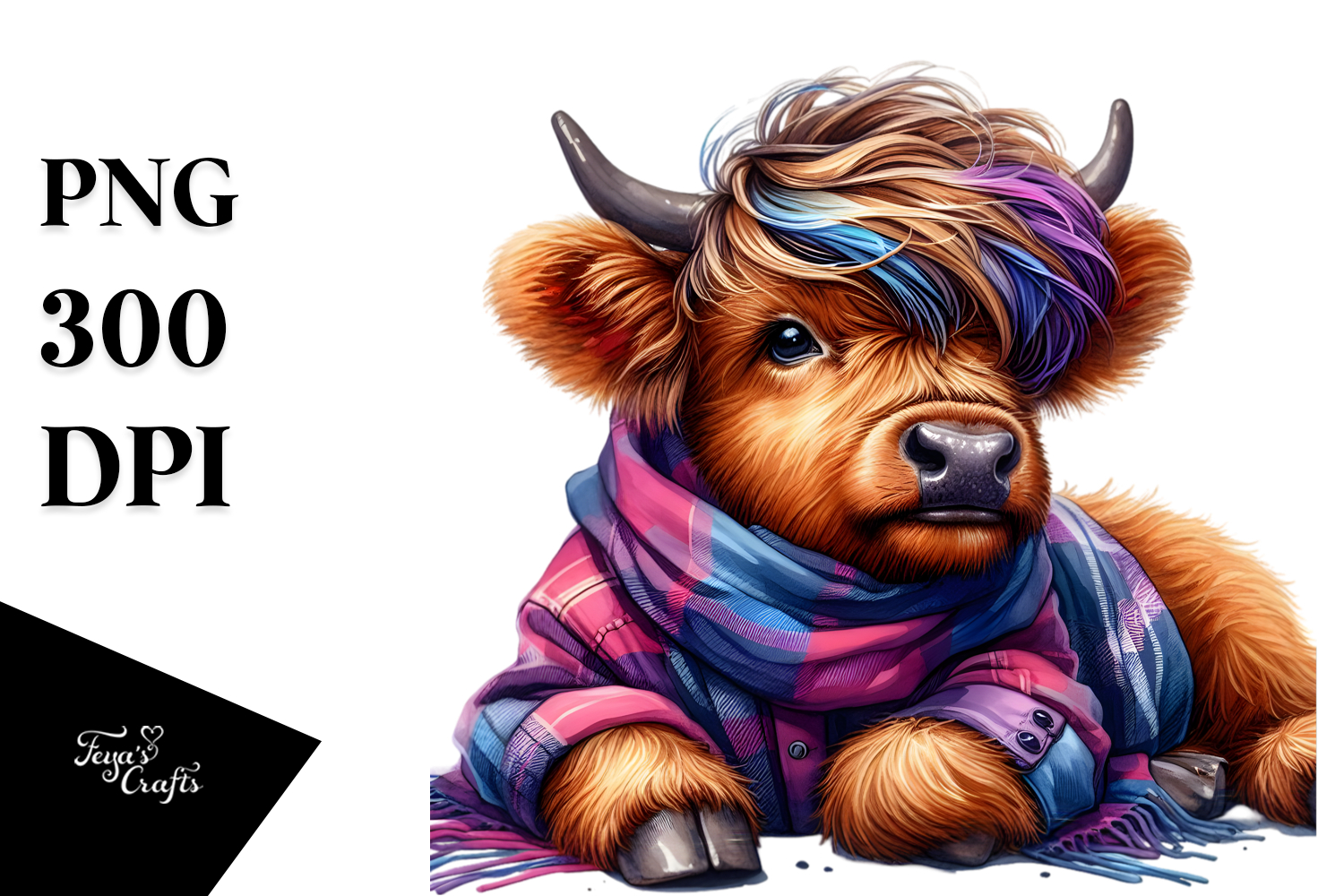Similar Design Products to Vibrant Highland Cow in Watercolor, High-Res PNG
