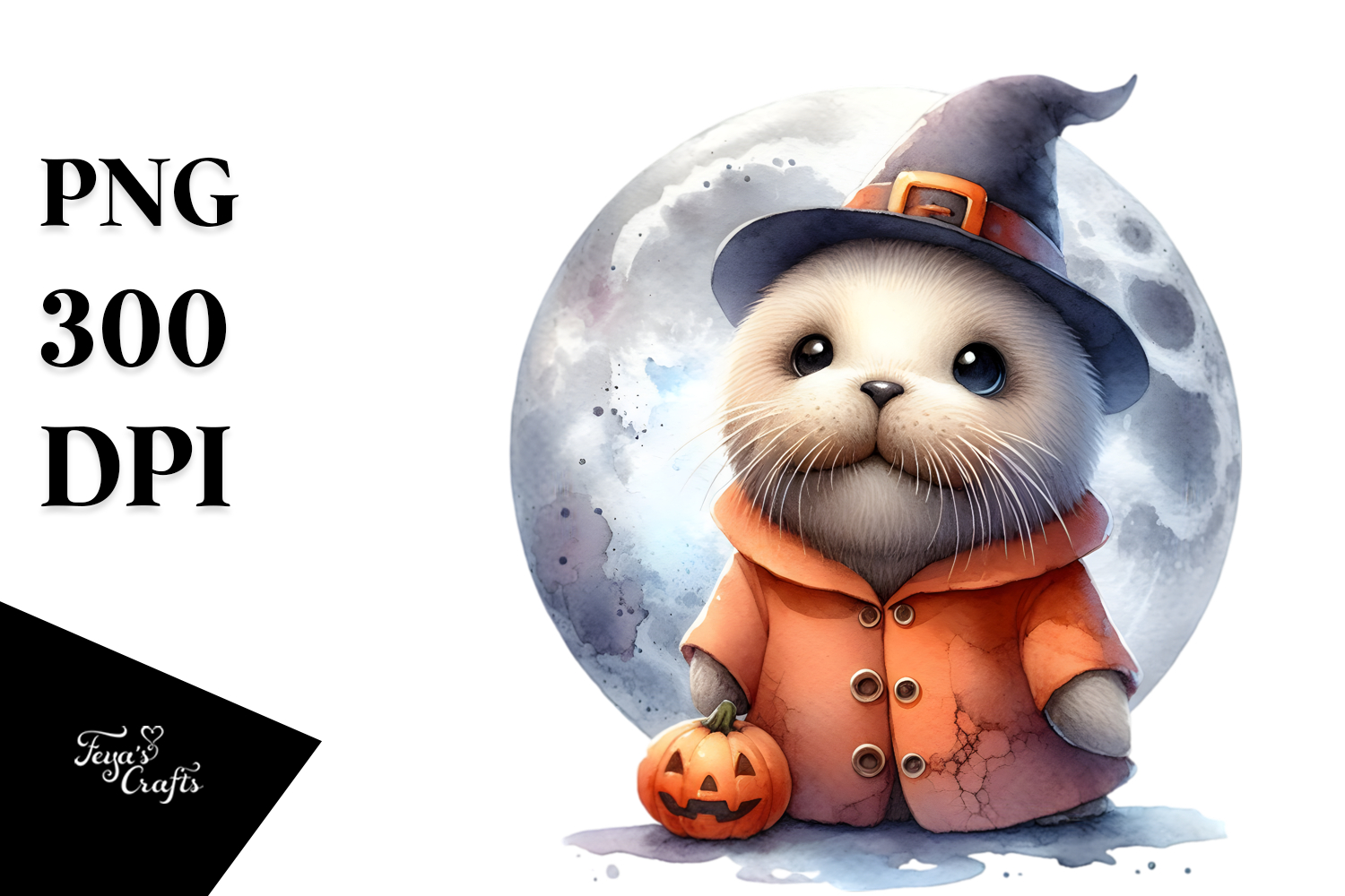 Watercolor Halloween Cute Baby Moon Washed Standing Walrus Dressed
