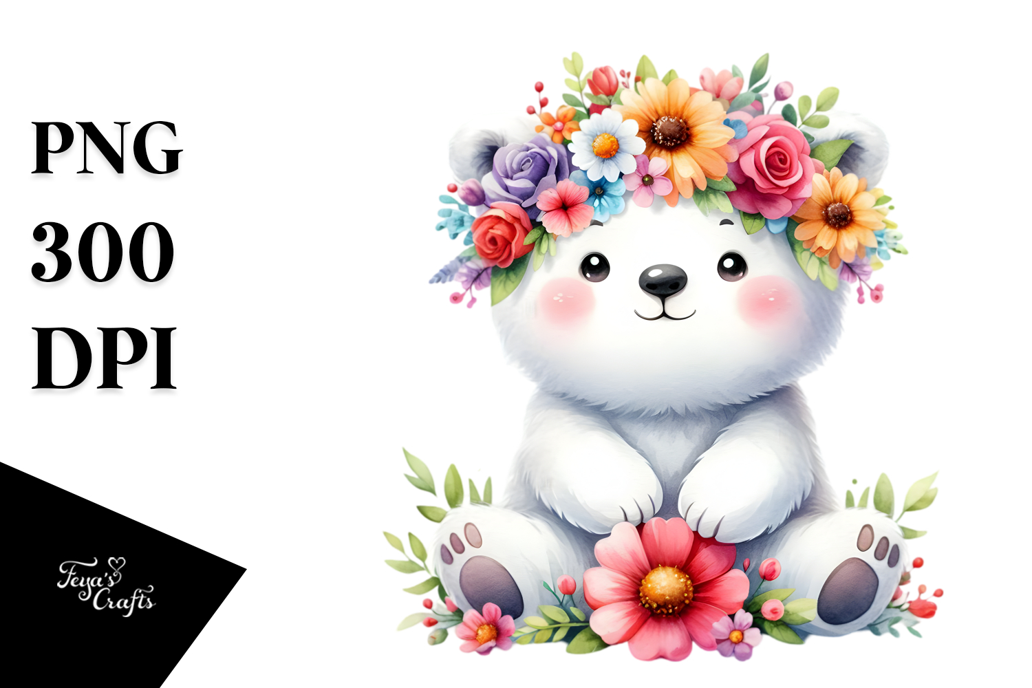 Sweet Polar Bear with Flower Crown, Cartoon Style PNG example image 1