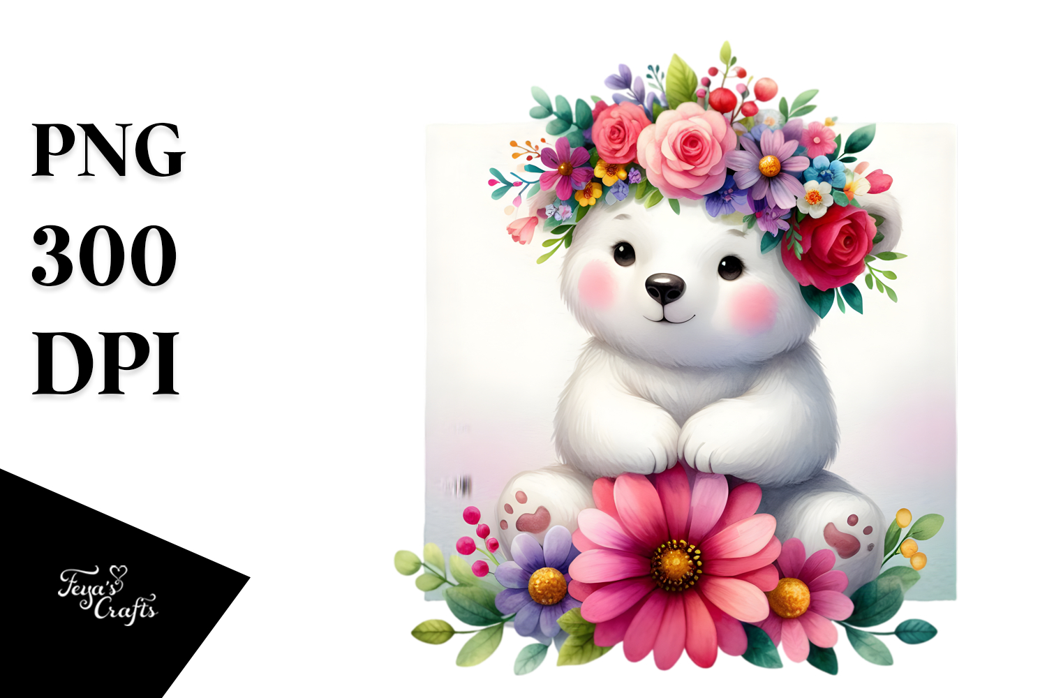 Cartoon-style Polar Bear with Flower Crown PNG example image 1