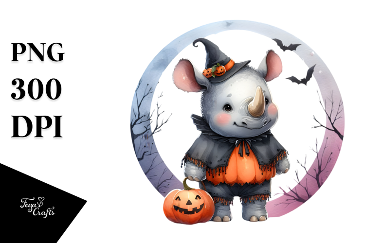 Cute Baby Rhino Halloween Washed Watercolor PNG example image 1