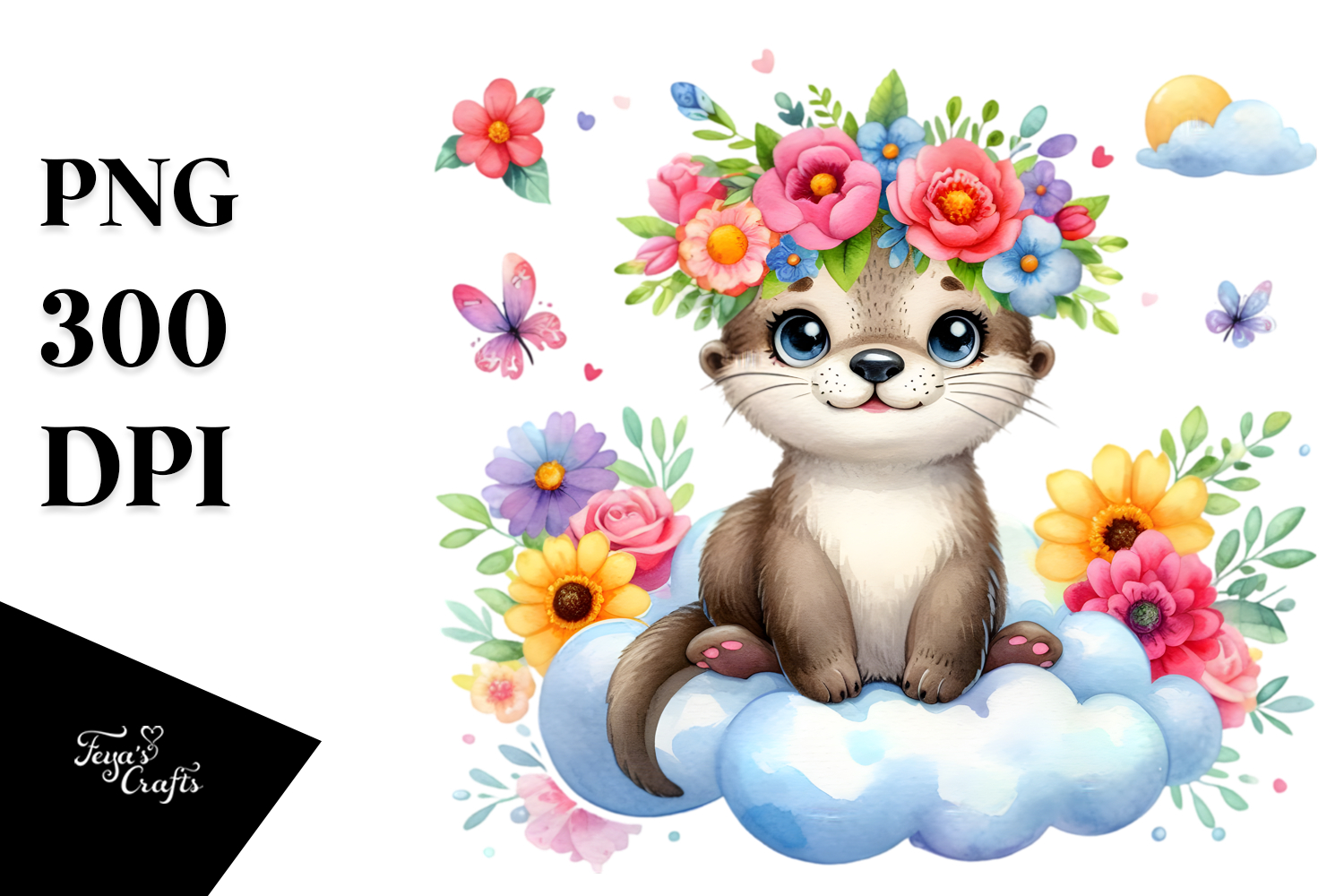 Cartoon-Style Flower Crown Otter PNG example image 1