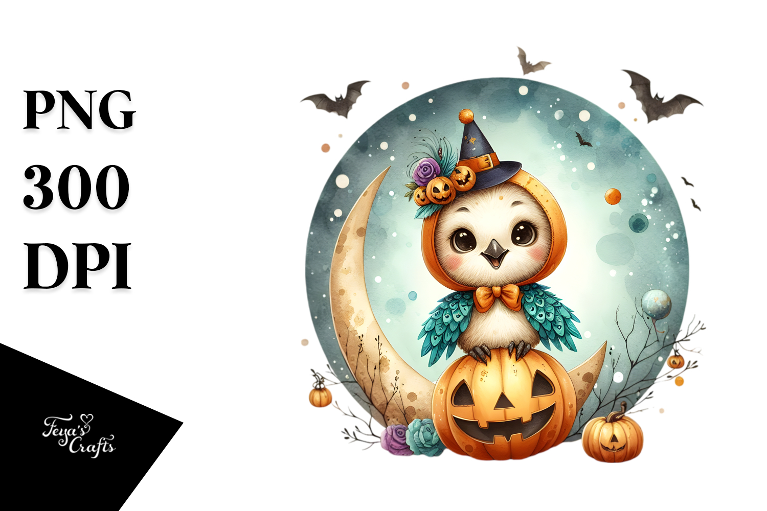 Retro Watercolor Halloween Cute Baby Moon Peacock Whitebackground Highdetails
