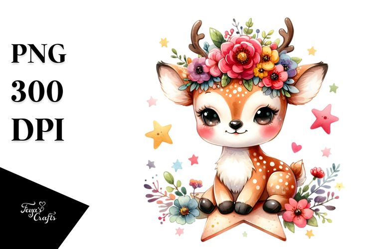 Cartoon Watercolor Sticker Summer Flower Sitting Deer Png Sublimation