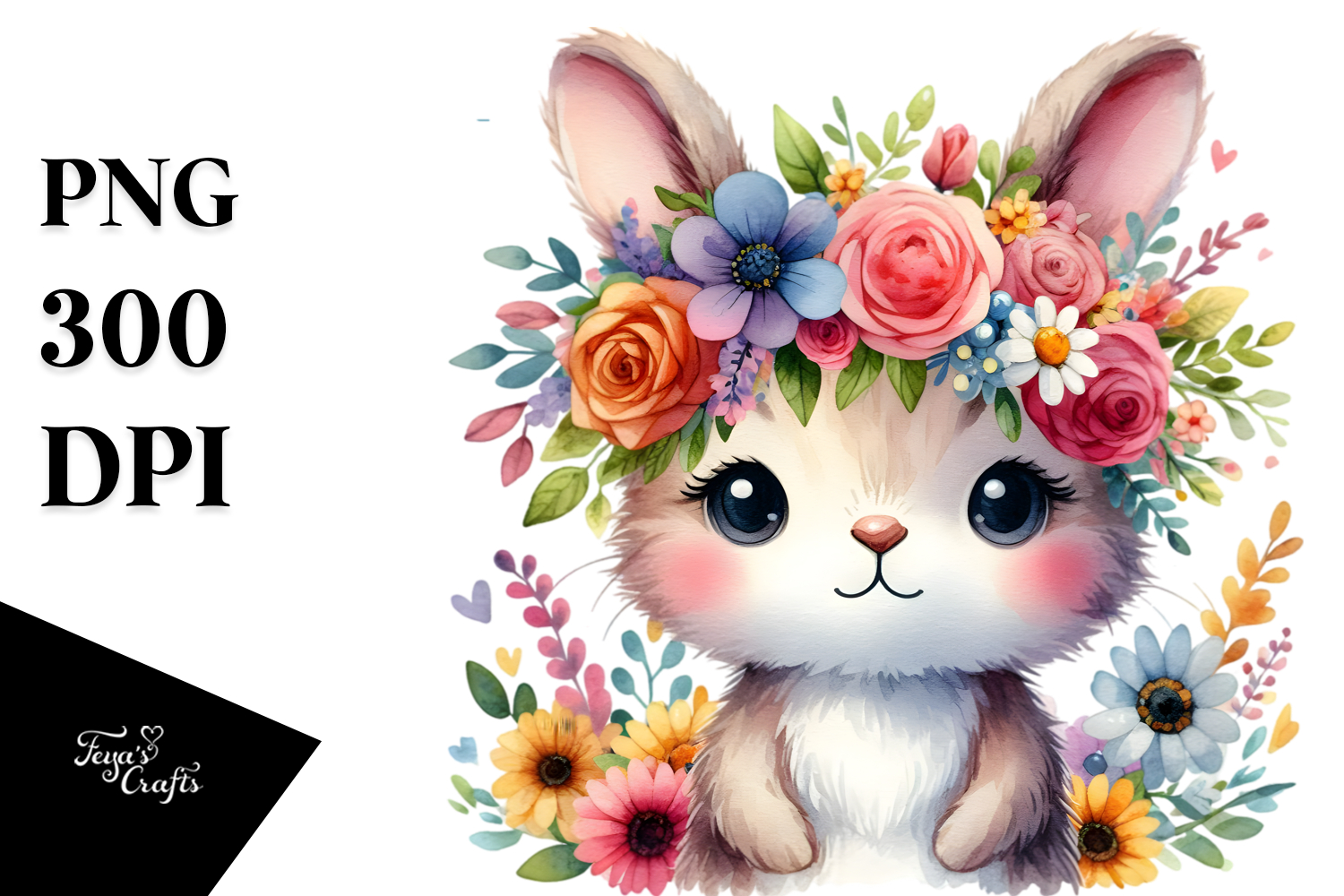 Watercolor Cute Bunny Cloud Sublimation Whitebackground Cartoon-style Pastelcolors Flowercrown