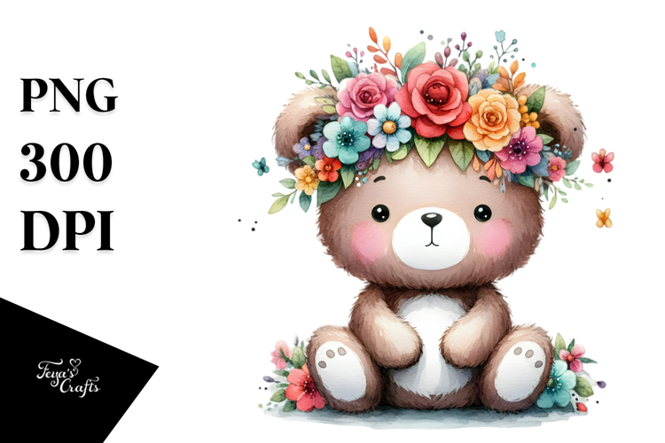 Cartoon Bear with Flower Crown, Cute PNG example image 1