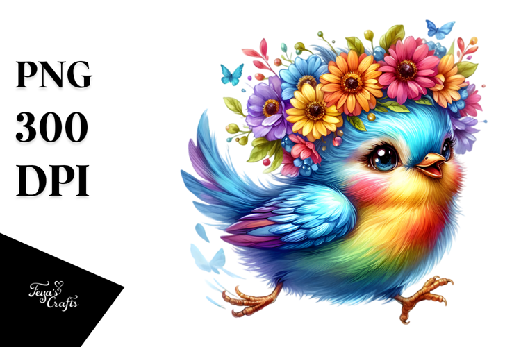 Happy Bird with Floral Wreath, PNG