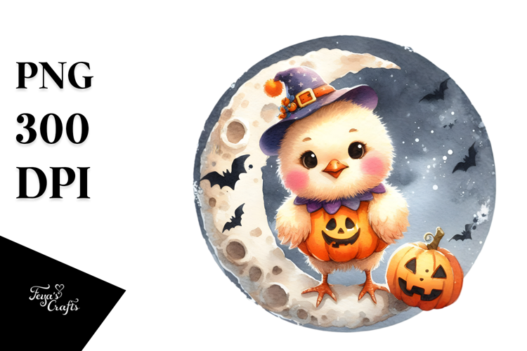 Cute Chicken Halloween Moon Watercolor PNG example image 1