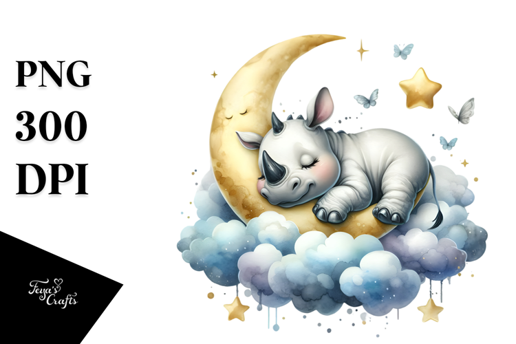 Whimsical Cute Baby Rhino Whitebackground Watercolorpainting Sleepingonacloud Sleepingonamoon