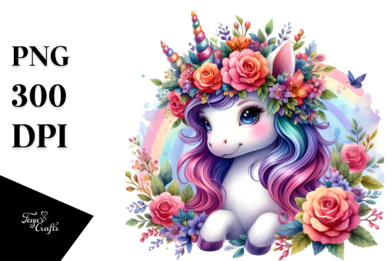 Cute Baby Unicorn with Floral Wreath PNG example image 1