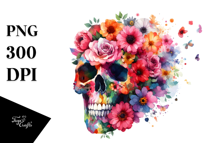 Watercolor Painting Skull Colorful Flowers Png Sublimation Whitebackground Cloudofdust