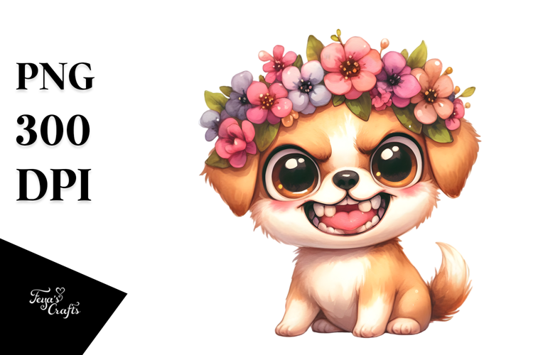 Cartoon Watercolor Painting Puppy Expressive Mischievous Sublimation Flowercrown Wideeyes