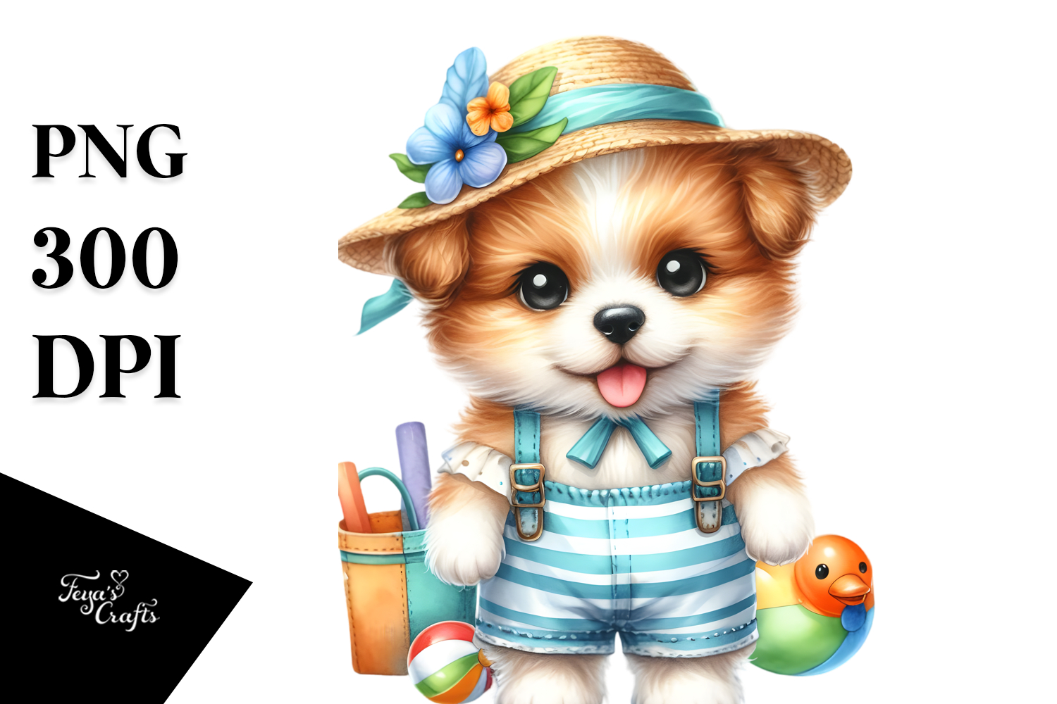 Watercolor Summer Cute Baby Beach Png Puppy Sublimation Whitebackground
