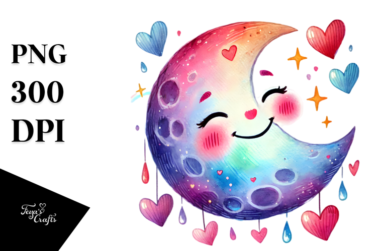 Smiling Moon with Hearts in Watercolor PNG example image 1