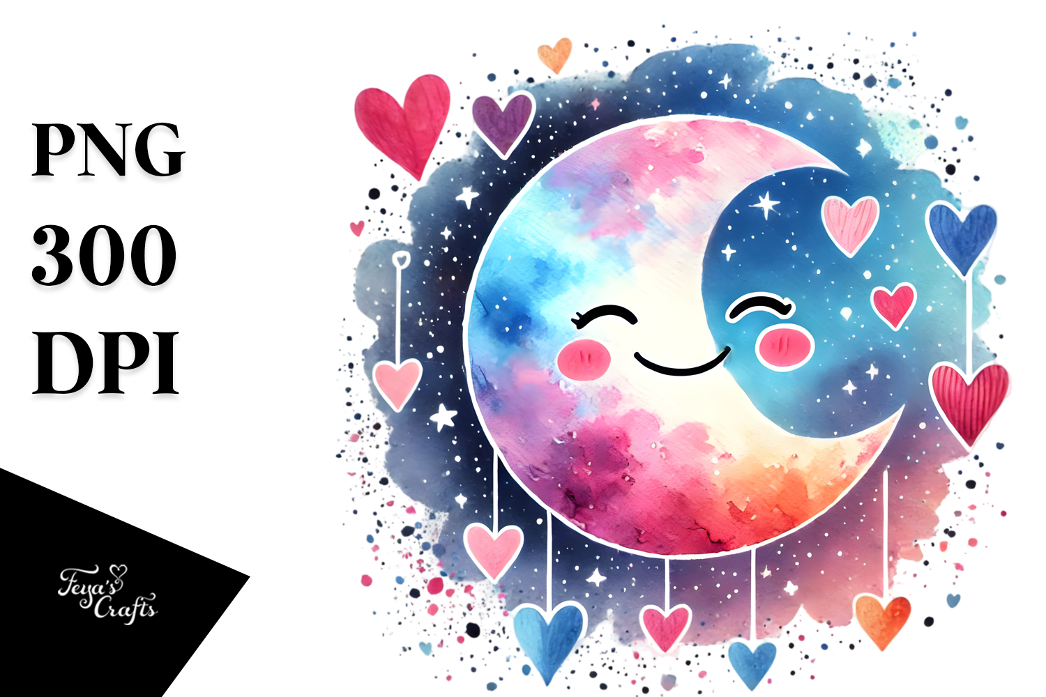 Simple Moon with Hearts in Watercolor PNG example image 1