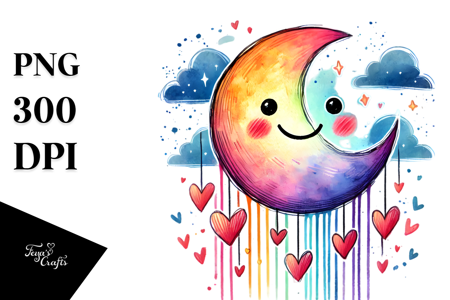 Smiling Moon with Hearts in Watercolor PNG example image 1