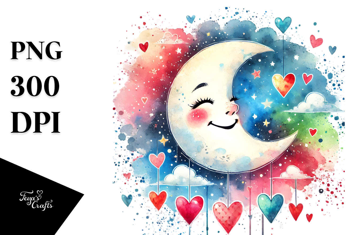 Watercolor Hearts Colorful Png White Moon Smiling Sublimation Digitalpainting