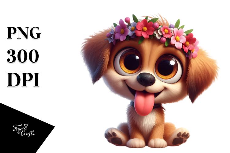 Goofy Cartoon Puppy with Flower Crown PNG example image 1