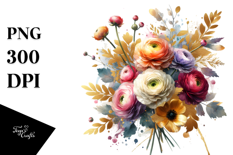 Colorful Bouquet with Gold Foil Ranunculus | Watercolor example image 1