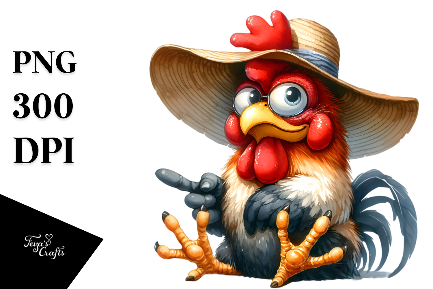 Funny Rooster with Sun Hat Watercolor Clipart example image 1