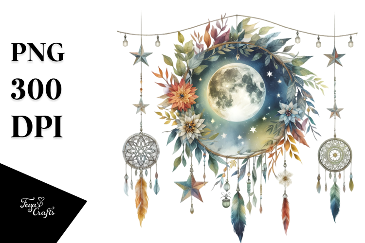 Similar Design Products to Vibrant Watercolor Boho Moon with Foliage Stars | Clipart