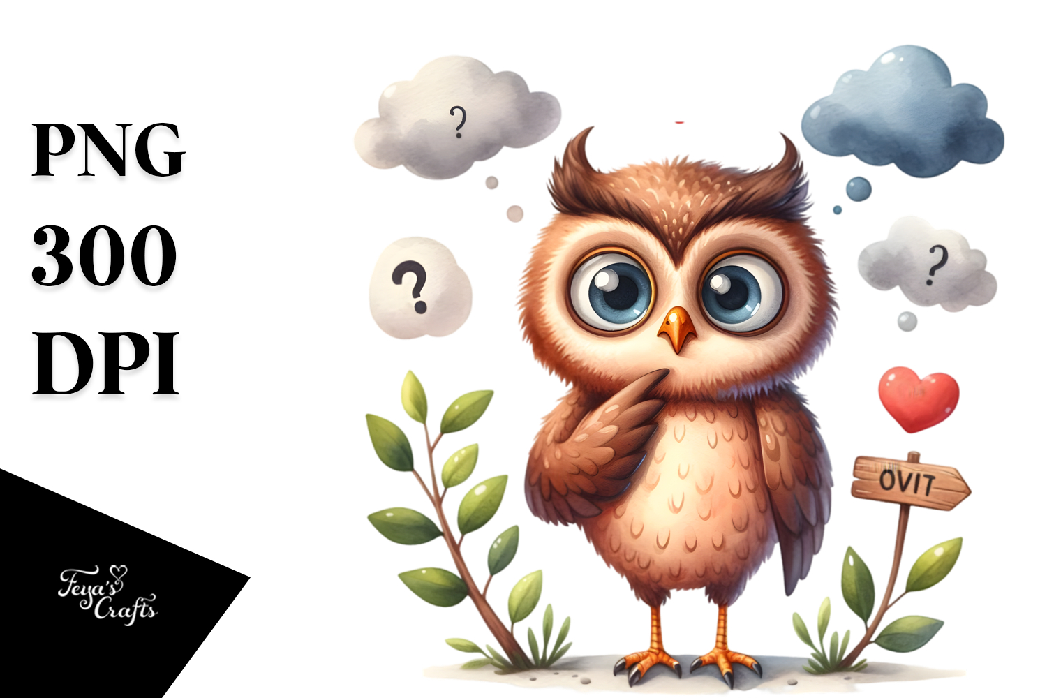 Funny Watercolor Elements Clipart Owl Thoughtful Whitebackground Bigeyes Goofyteeth