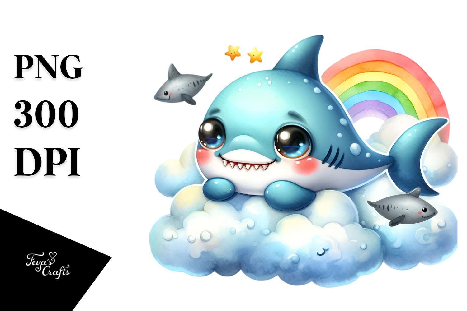 Colorful Watercolor Baby Shark Resting on Cloud example image 1