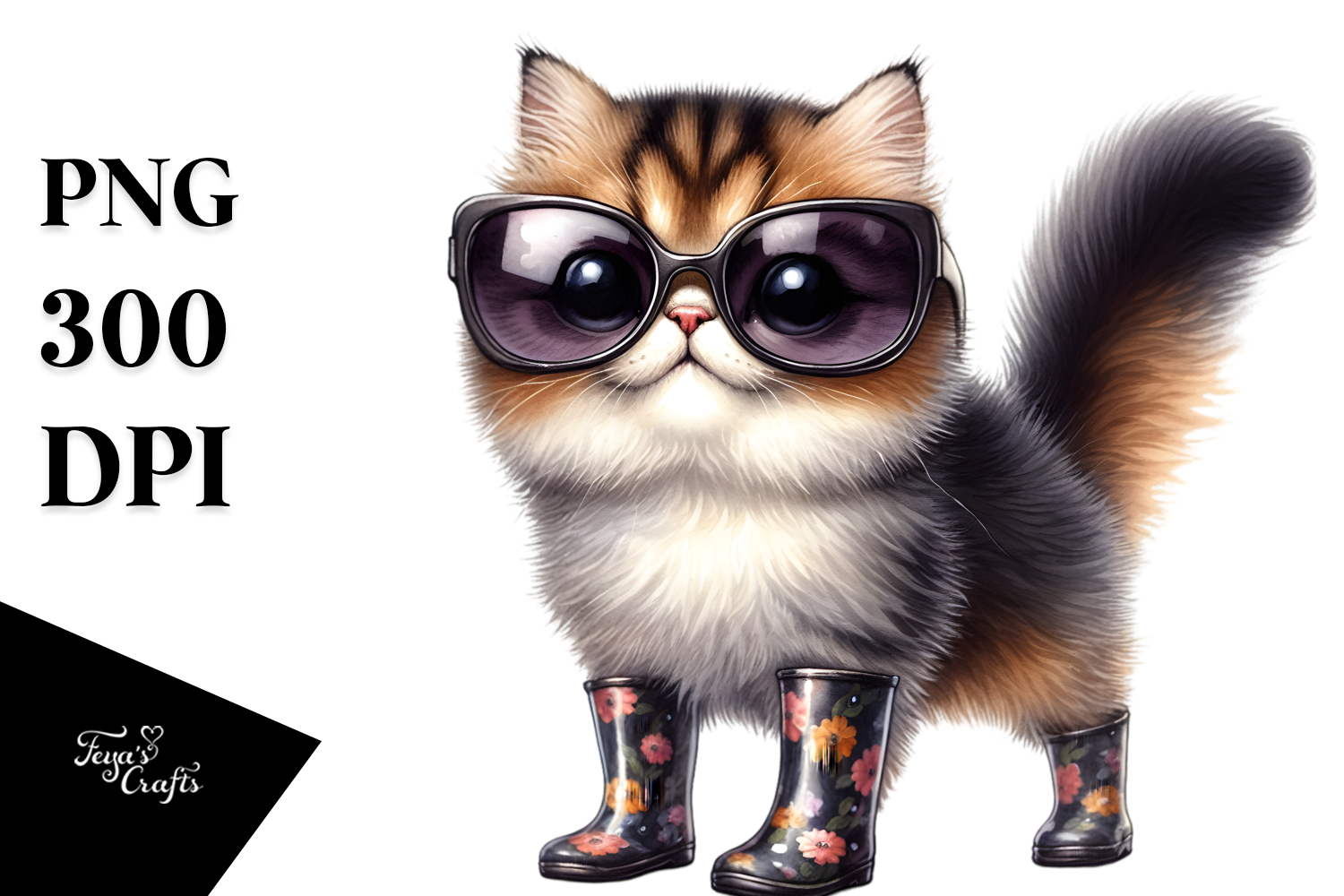 Cat with Sunglasses Standing Up in Rain Boots | Clipart example image 1