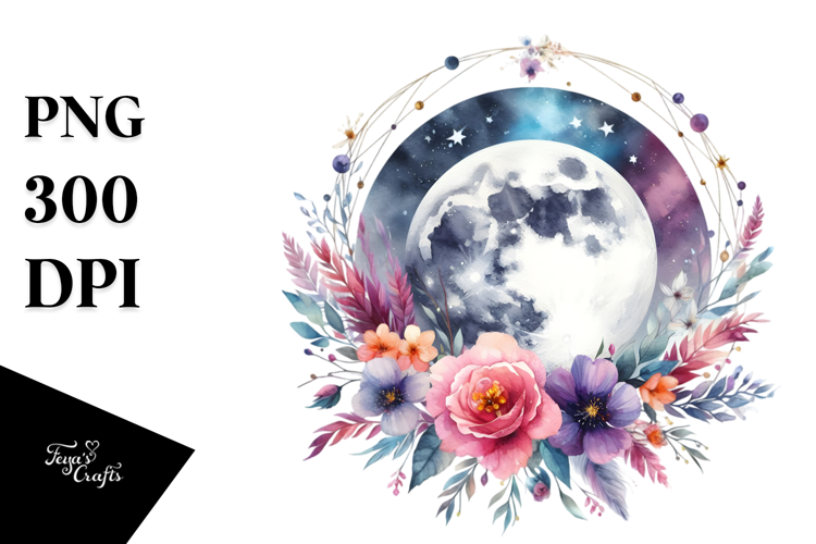 Vibrant Watercolor Moon With Flowers example image 1
