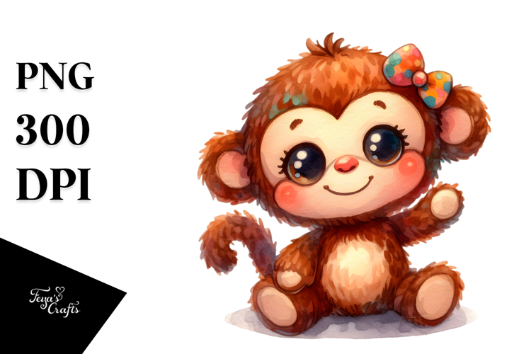 Vibrant Watercolor Cute Baby Old Plush Monkey example image 1