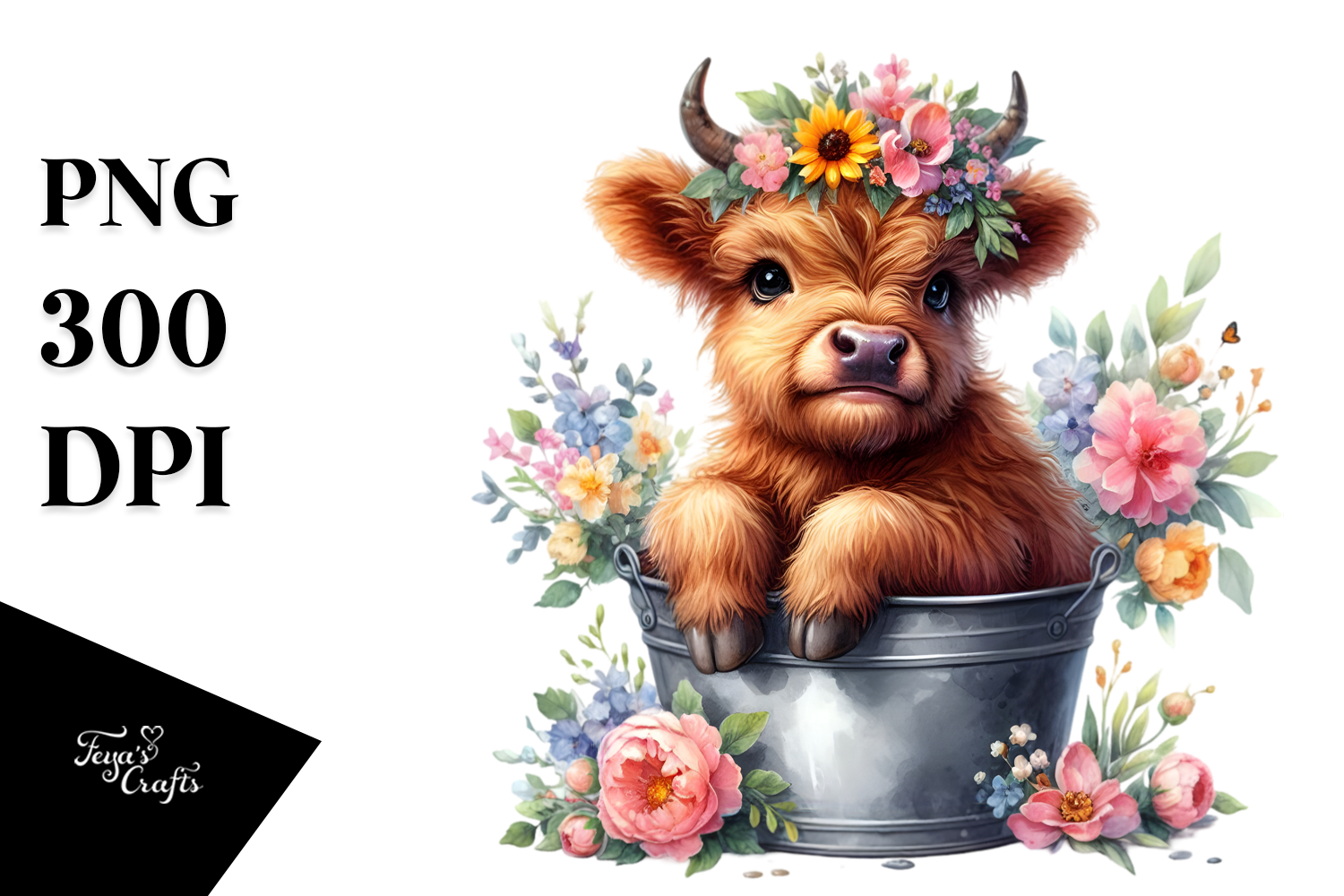 Cute Baby Highland Cow Smiling with Flowers | Sublimation | example image 1
