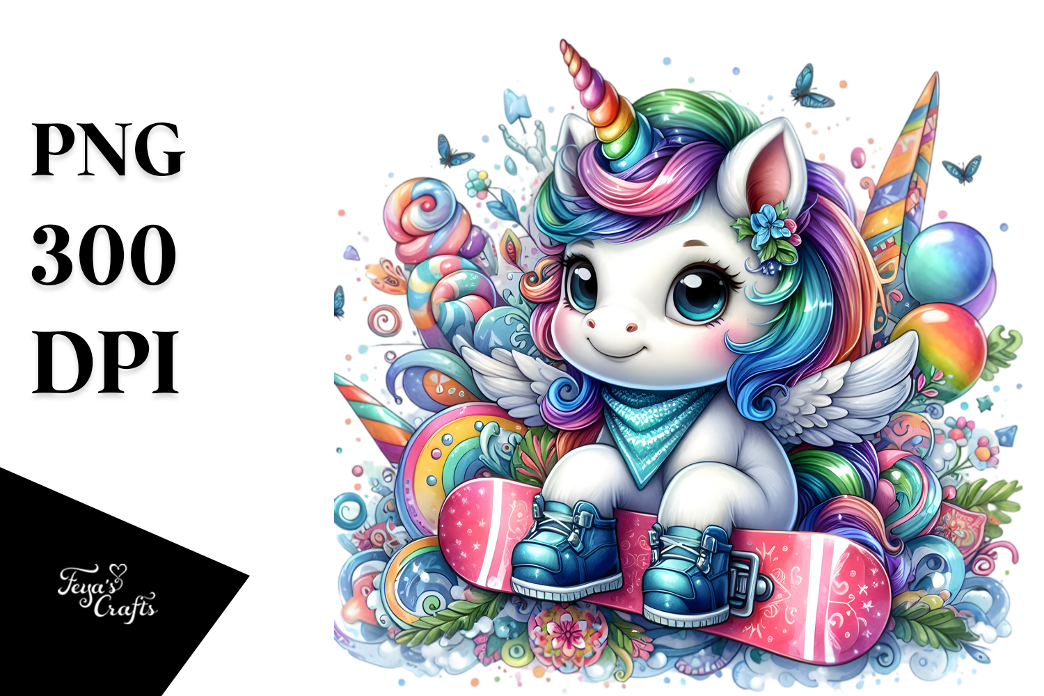 Colorful Unicorn with Snowboard PNG